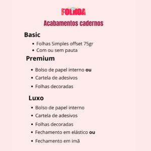As opções de tipo de folhas e inclusão da cartela de adesivos devem ser selecionadas no momento da compra.