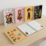 O produto oferece opções de personalização, permitindo que o cliente escolha o tipo de folhas e a inclusão da cartela de adesivos no momento da compra.